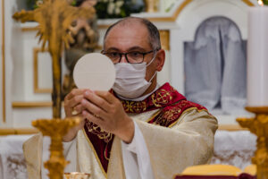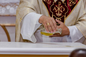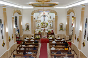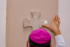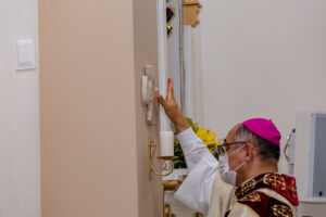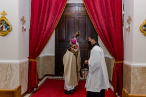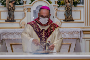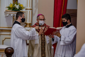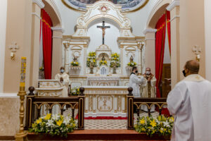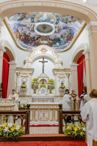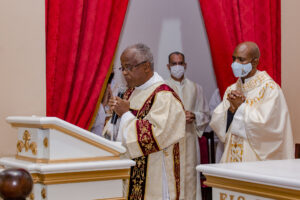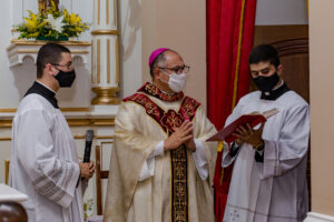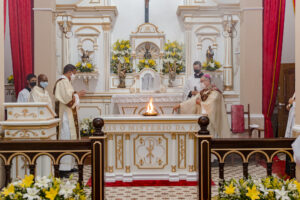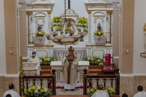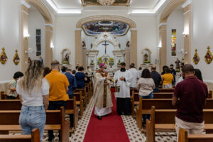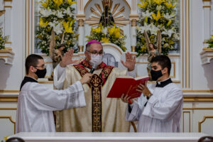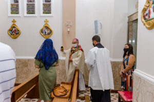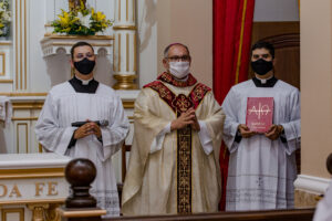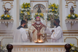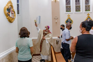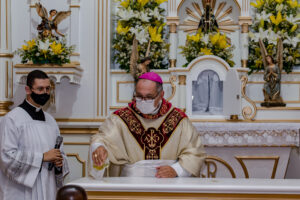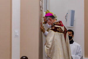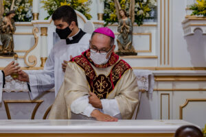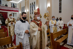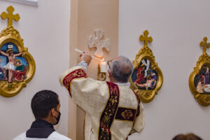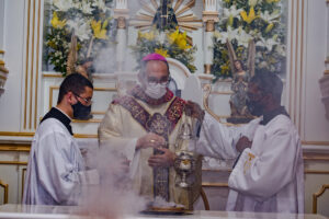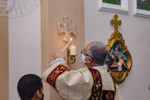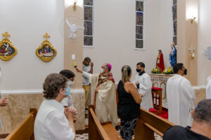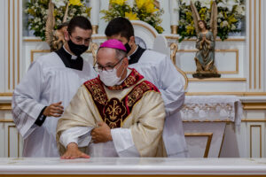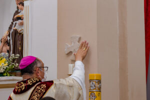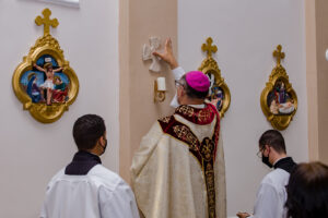 Após a homilia, aconteceu o rito de Dedicação, com Dom Gregório Paixão ungindo e abençoando o novo Altar, as paredes da Igreja, e, a cada coluna que ele passava, deixava as marcas de sua mão nos crucifixos que ali estavam. As paredes e a Igreja inteira foram incensadas.