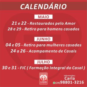 De acordo com ele, o calendário está pronto para o ano todo. “Neste mês de maio teremos o Restaurados Pelo Amor nos dias 21 e 22, esse retiro é uma declaração do amor de Deus para o casal ; dias 28 e 29 de maio teremos o Retiro para Homens Casados, esse retiro remete o homem à sua primeira missão, ser o sacerdote da sua casa, homens de joelhos famílias de pé”.