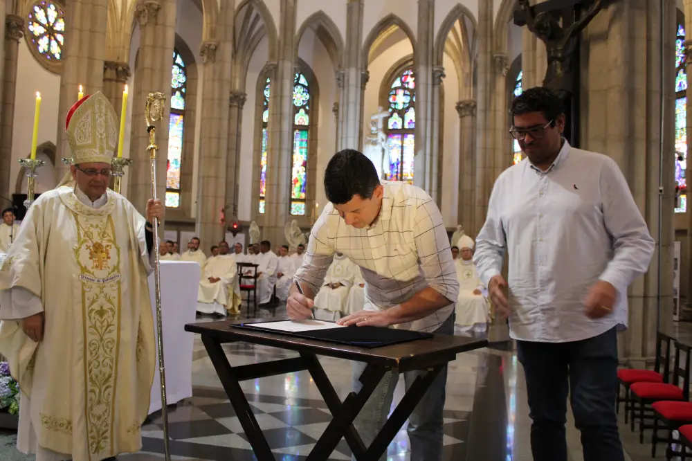 Um dos momentos mais significativos da celebração foi a assinatura da lei que institui o feriado municipal em honra a São Pedro de Alcântara, realizada pelo prefeito Hingo Hammes ao final da missa. A iniciativa, proposta pelos vereadores Thiago Damaceno e Marquinhos Almeida, reconhece oficialmente a importância do padroeiro para a identidade religiosa e cultural da cidade de Petrópolis.