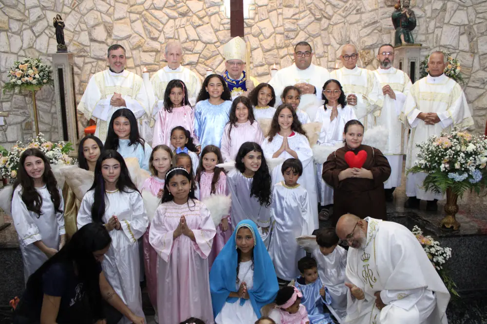 Ao final da celebração, um momento especial emocionou os presentes: a coroação de Nossa Senhora, realizada com a participação de várias crianças da comunidade paroquial. O gesto expressou o carinho, a devoção e a confiança dos fiéis na intercessão da Virgem Maria.