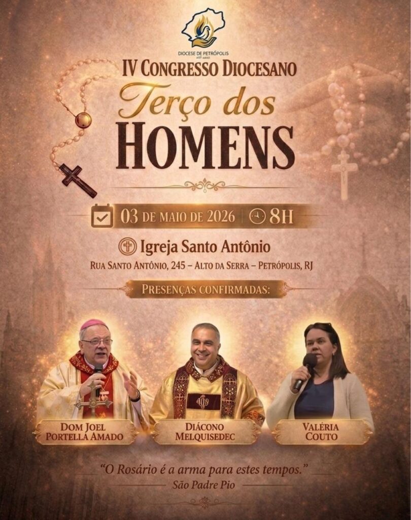 A Diocese de Petrópolis promove, no dia 3 de maio, a partir das 8h, o IV Congresso Diocesano do Terço dos Homens, na Igreja Santo Antônio, no Alto da Serra, em Petrópolis. Neste ano, o encontro traz como tema a frase de São Padre Pio: “O Rosário é a arma para estes tempos”, sublinhando a atualidade e a urgência da oração mariana em meio aos desafios do mundo de hoje.