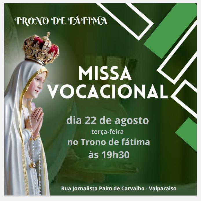 Nesse dia, acontecerá a Missa Vocacional no Trono de Fátima, às 19h30, com a presença de todos os seminaristas, postulantes, sacerdotes, freiras, e todos os demais que vivem um chamado de especial consagração.