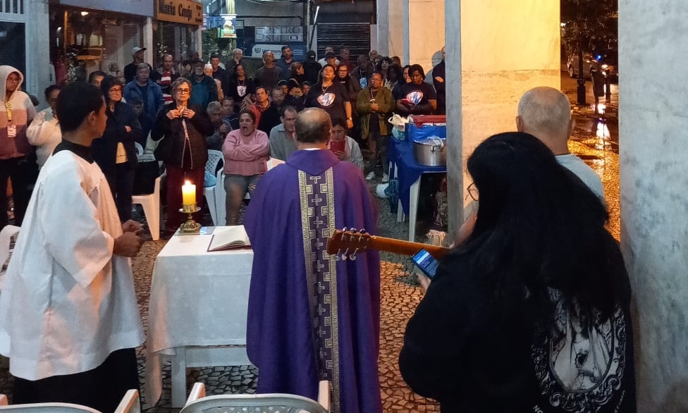 A Santa Missa foi presidida pelo Padre Nerel Quirino Damasceno, que conduziu a celebração com palavras de acolhimento, consolo e dignidade. A presença de dezenas de pessoas em situação de rua, voluntários e membros da comunidade deu um testemunho vivo do Evangelho, que nos chama a reconhecer o rosto de Cristo nos que mais sofrem.