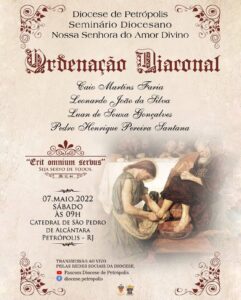 Em pleno Ano Eucarístico Diocesano, a Diocese de petrópolis terá a graça de ordenar quatro jovens seminaristas ao ministério diaconal, no dia 7 de maio, às 9h, na Catedral São Pedro de Alcântara, em Petrópolis e com a graça de Deus, em dezembro serão ordenados sacerdotes.