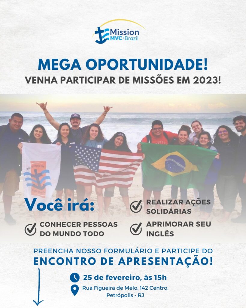 Aos que desejam participar como voluntários, a Mission Brazil ainda tem vagas. Será realizado um Encontro de Apresentação no dia 25 de fevereiro, às 15h, no Centro Pastoral do MVC. Para entrar em contato e participar, estão disponíveis o número de Whatsapp (24) 98877-0812 e o Instagram @mvcmissionbrazil.