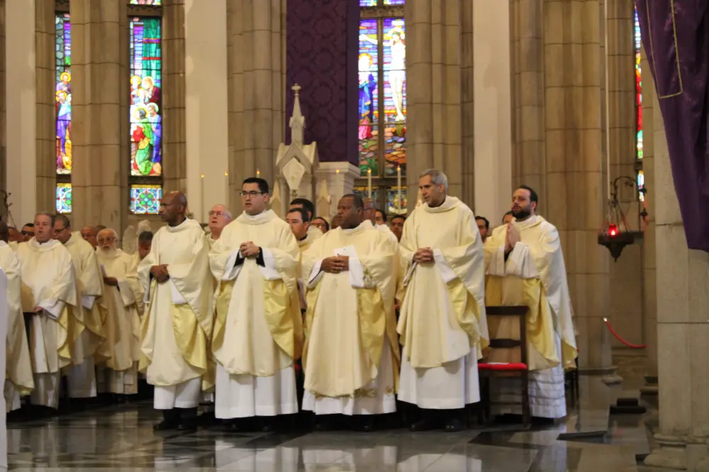 Na manhã desta quinta-feira, 2 de abril, na Catedral São Pedro de Alcântara, em Petrópolis, o bispo diocesano, Dom Joel Portella Amado, presidiu a Missa dos Santos Óleos e a renovação das promessas sacerdotais. A celebração, que abre o Tríduo Pascal na Diocese de Petrópolis, reuniu o clero diocesano em torno do seu bispo na Catedral, para a bênção dos óleos e a reafirmação do “sim” de cada padre ao seu ministério.