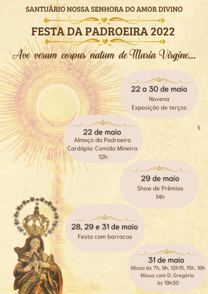 Durante nove dias, a comunidade de Correas realizou a novena em preparação a festa de sua padroeira e da Diocese, Nossa Senhora do Amor Divino, que acontece no dia 31 de maio. O bispo diocesano, Dom Gregório Paixão, OSB, vai presidir a missa das 19h30, na primeira festa da imagem depois da Coração Pontifícia.