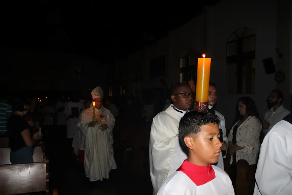 A celebração teve início na porta da Igreja Matriz, com a bênção do fogo novo, presidida por Dom Joel, ao lado do administrador paroquial, padre Leonardo João. Em seguida, o bispo acendeu o Círio Pascal, símbolo de Cristo, luz verdadeira que dissipa as trevas do pecado e da morte. No Círio, foram colocados os cinco cravos, que recordam as chagas de Jesus na cruz.