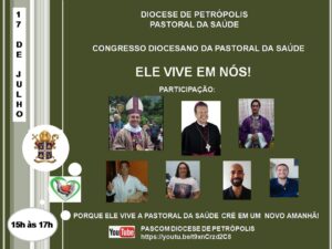 A Pastoral da Saúde da Diocese de Petrópolis realiza, neste sábado, dia 17 de julho, o Congresso Diocesano On-line, com participação de Dom Paulo Celso, bispo auxiliar da Arquidiocese do Rio de Janeiro e de Dom Gregório Paixão, OSB, bispo da Diocese de Petrópolis. O encontro que tem início às 15h, com transmissão pelo canal da Pastoral da Comunicação da Diocese de Petrópolis no Youtube (www.youtube.com/c/PetropolisPascom), tem como tema central “Ele vive em nós”.