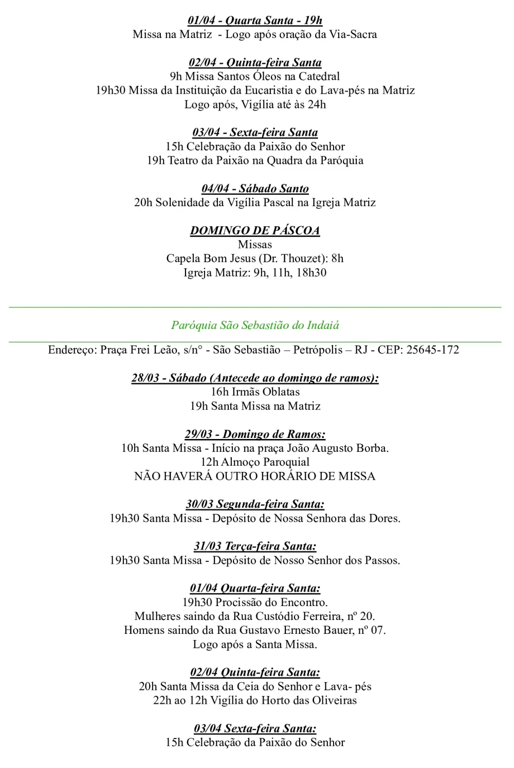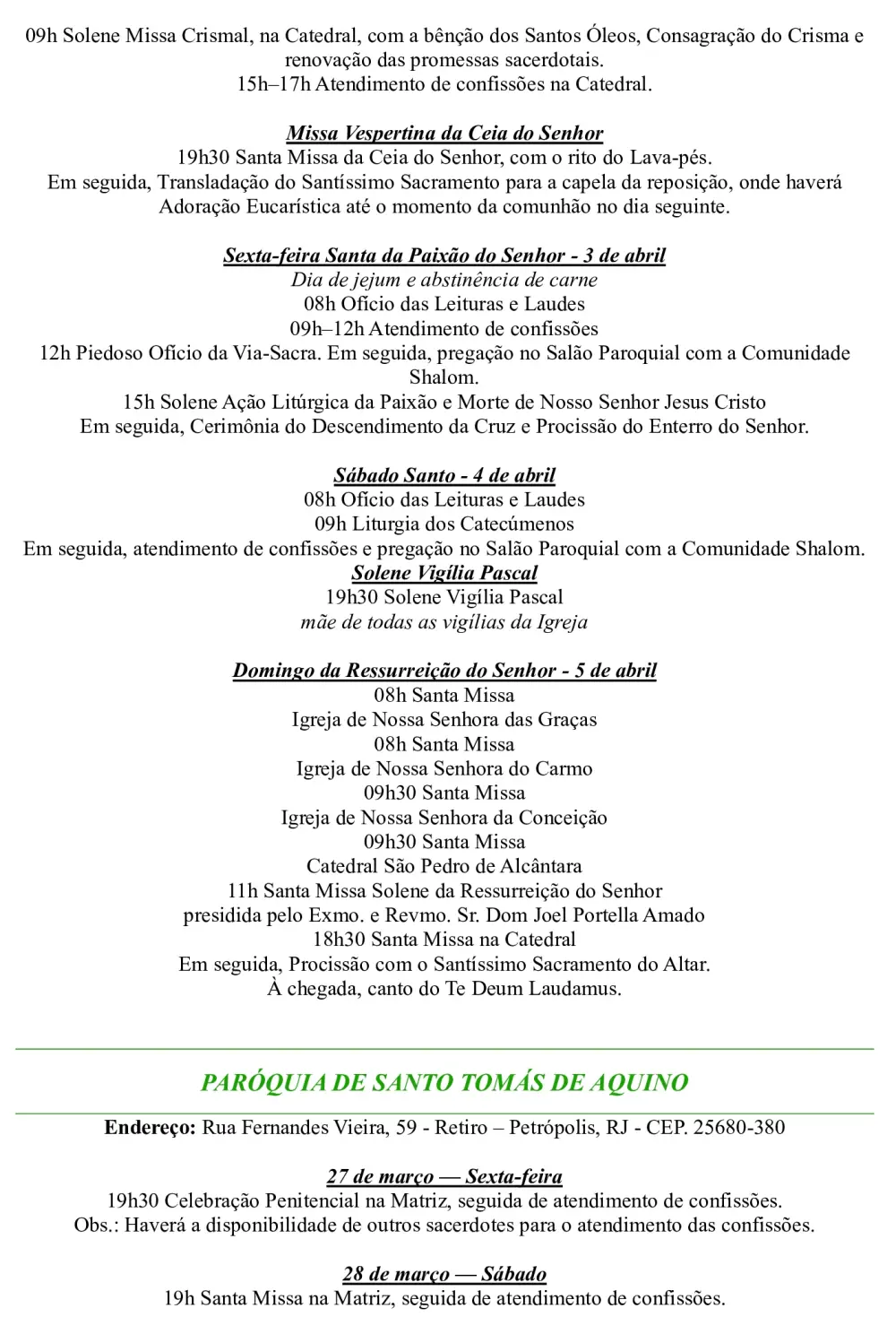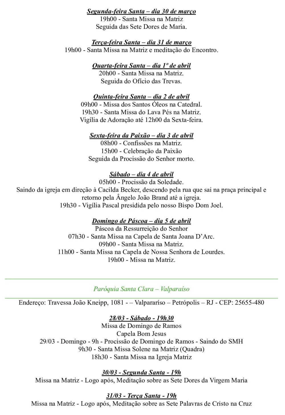 Programação Semana Santa 2026 – Decanato São Pedro de Alcântara – 1º Distrito de Petrópolis