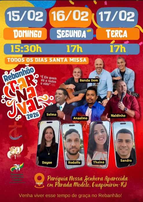 Já no Decanato São José de Anchieta, que reúne as paróquias de Magé e Guapimirim, será realizado o tradicional Rebanhão de Carnaval, na Paróquia Nossa Senhora Aparecida, em Parada Modelo. A programação acontece nos dias 15 (às 15h30), 16 (às 17h) e 17 de fevereiro (às 17h), com a presença da Banda Dom e lideranças carismáticas como Selmo, Anselmo, Naldinho, Dayse, Rodolfo, Thianá e Sandro.