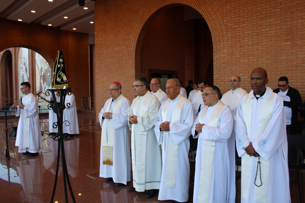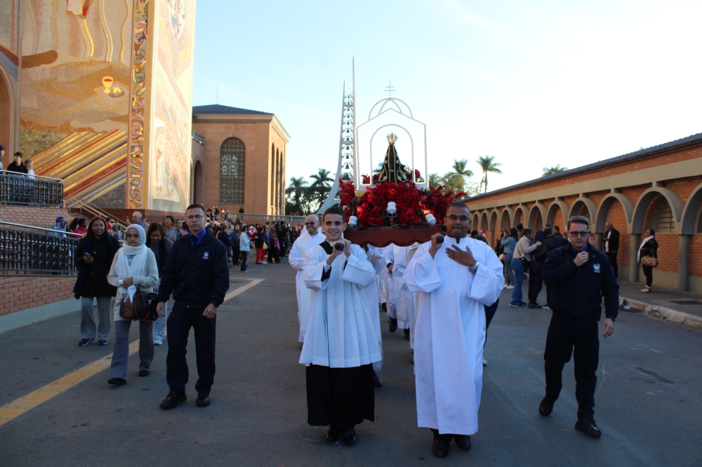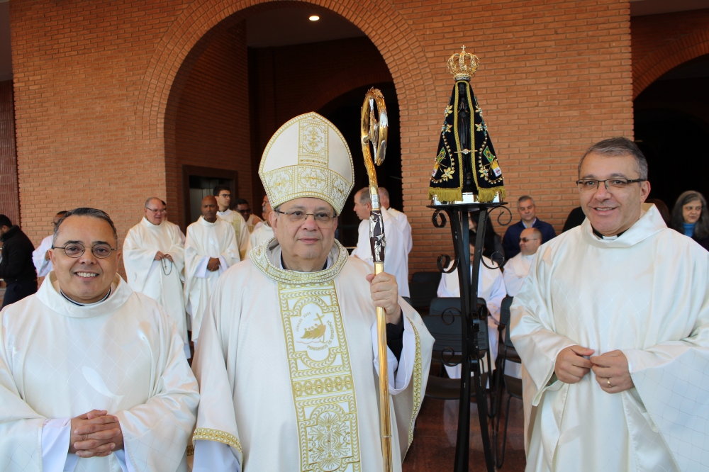Durante a celebração da Santa Missa, na Basílica de Nossa Senhora Aparecida, Dom Joel, ao comentar sobre o Mês Vocacional, lembrou os 25 anos de sacerdócio do Padre Renato Gomes de Andrade e do Padre Carlos Silva de Oliveira. Na procissão de entrada, os dois sacerdotes levaram a imagem de Nossa Senhora Aparecida até o altar.